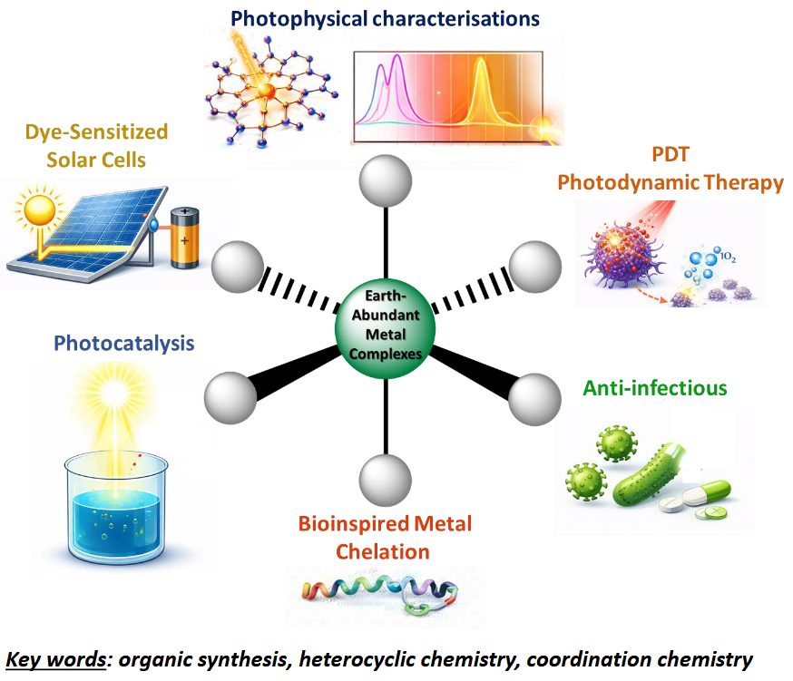 The scientific activity of the Ingénierie de Complexes Métalliques (InCoMe) team focuses on the design and synthesis of earth-abundant metal complexes spanning applications from energy conversion to biological fields, including dye-sensitized solar cells (DSSC), photocatalysis, photodynamic therapy (PDT), as well as antioxidant, anti-inflammatory, and anti-infectious activities.