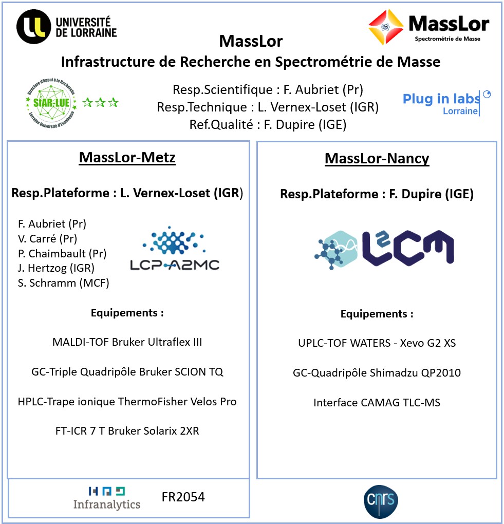 Le site MassLor-Metz est de plus intégré au Réseau National Infranalytics dédiées à la caractérisation et à l’analyse chimiqueen Spectrométrie de Masse FT-ICR à très haut champ (FT-ICR – FR2054). Les chercheurs peuvent ainsi avoir un accès privilégié à la spectrométrie de masse à très haute résolution (voir Infranalytics).