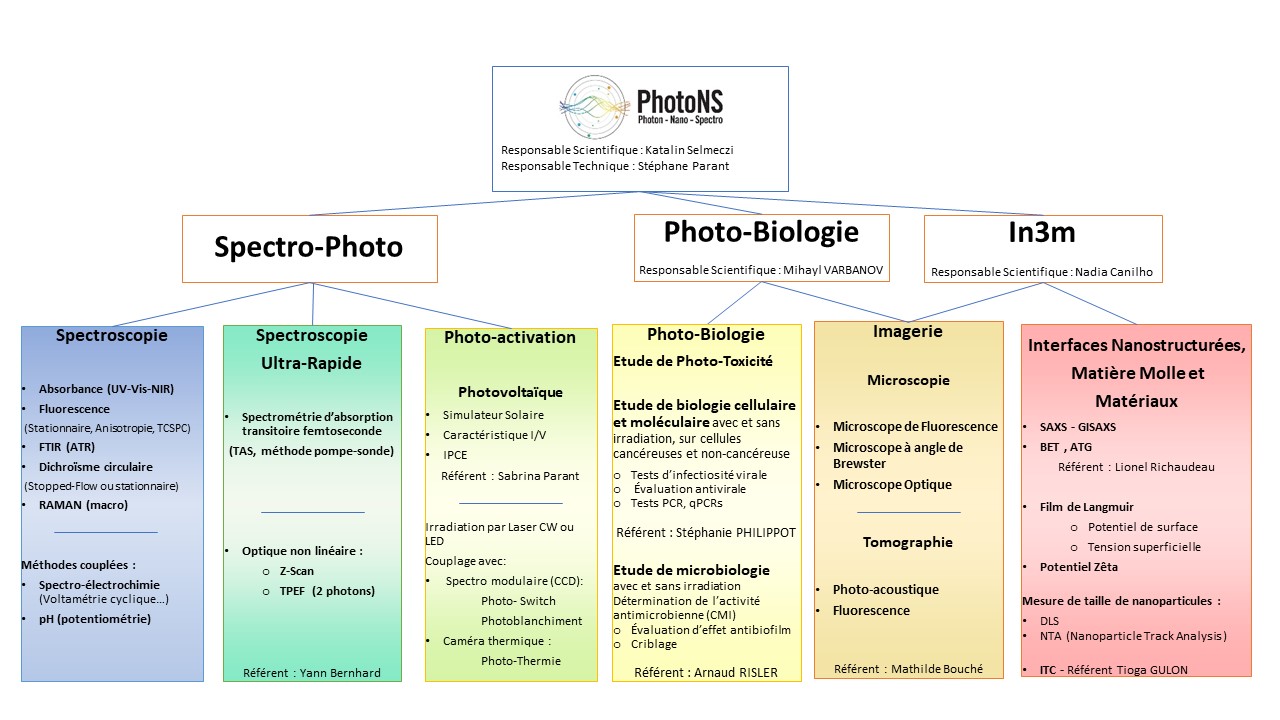 Elle permet l’étude photo-physiques (spectres d’absorbance, de luminescence stationnaire ou résolue dans le temps), l’étude de nanoparticules (tailles, potentiel Zeta), la mesures d’isothermes d’adsorption et structurale (SAXS) des matériaux mésoporeux, la caractérisation de cellules solaires (I/V, IPCE), la détermination de rendement de fluorescence, photothermique ou photovoltaïque.