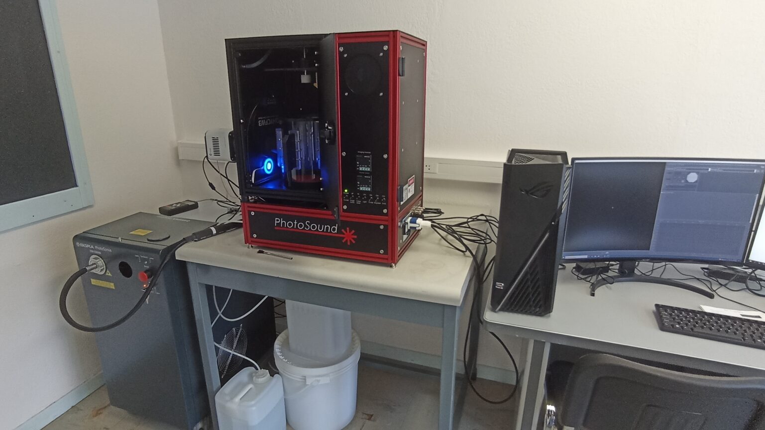 Cette plateforme d’imagerie basée sur la tomographie (T) photoacoustique (PA) et fluorescence (F), le PAFT Tritom fourni par PhotoSound, est composée de :