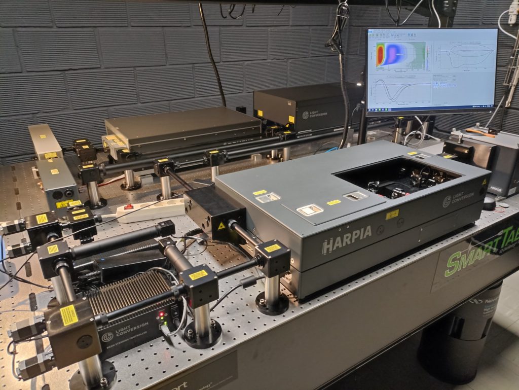 - D’un spectromètre HARPIA pour les mesures d’absorption transitoire (expérience pompe-sonde), avec générateur de lumière blanche (supercontinuum), ligne à retard jusqu’à 8 nanosecondes avec une résolution de 10 fs, détecteur multicanaux (Andor Kymera-193i avec tourelle à double réseau UV/Vis et NIR) et support d’échantillon motorisé.