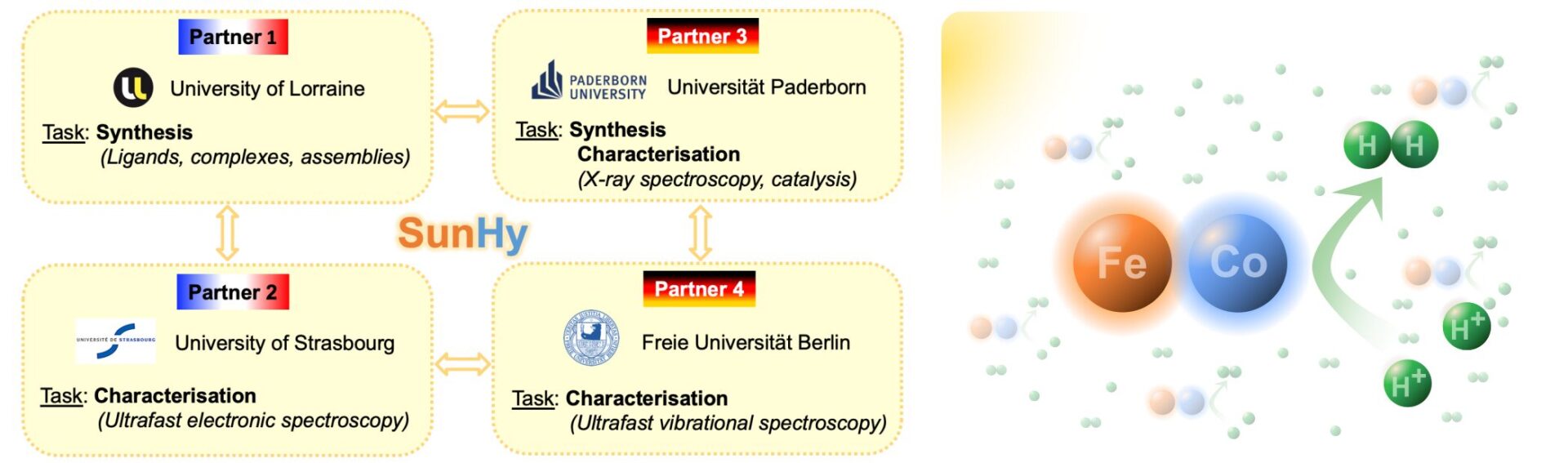 The SunHy project will be developed within an ANR French-German consortium with complementary recognized expertise from chemical design and synthesis (L2CM, UPB) to characterization techniques, notably advanced ultrafast spectroscopies (UPCMS, UPB, FUB).