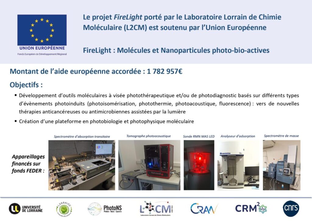 L’approche scientifique du projet « Fire Light » répond à la priorité d’innovation du FEDER, qui est ici la thérapie assistée par la lumière. L’originalité de « Fire Light » réside aussi dans une véritable approche multi-échelles allant de l’orbitale à l’animal. Il se base sur un consortium multi- et transdisciplinaire, alliant la théorie à l’expérience et regroupant des compétences de chimie organique, physico-chimie, biologie cellulaire et moléculaire.