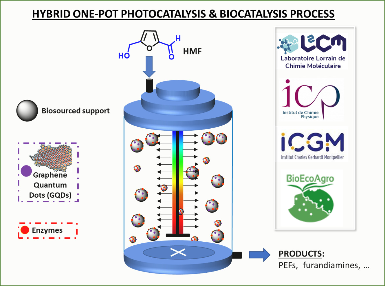 Within the framework of the PEPR B-BEST : « Biomasses, biotechnologies et technologies durables pour la chimie et les carburants », the GQD-BIOCAT projet will develop a sustainable platform for biomass valorization by integrating photocatalysis and biocatalysis in a single, modular reactor. The project targets the selective conversion of the biomass-derived platform molecule 5-HMF into high-value chemicals and polymers under mild, light-driven conditions. By combining hybrid catalytic materials with enzyme catalysis, GQD-BIOCAT aims to deliver an efficient, flexible, and scalable route toward greener chemical manufacturing.