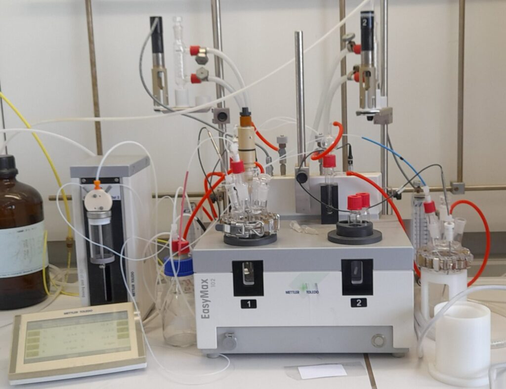 - Robot EasyMax 102 Basic: 2 réacteurs de 100ml pilotés par écran tactile (contrôle précis des paramètres de réaction permettant de définir les conditions optimales : température entre -40 °C et 180 °C sans bain de glace, bain d’huile, chauffe-ballon ou cryostat, agitation, addition des réactifs, données d’expérience enregistrées, expériences sans surveillance, optimisation en toute sécurité).